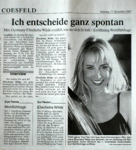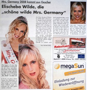 Mrs. Germany 2008 kommt aus Gescher   Elischeba Wilde, die „schöne wilde Mrs. Germany“   Alles begann mit einer Idee des Großvaters von Paris Hilton, der schwer nur nachvollziehen konnte, dass verheiratete Frauen weniger attraktiv sein sollen als unverheiratete und der vor ca. 15 Jahren „Mrs. World“ ins Leben rief. Er tat es, um genau …