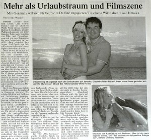 Anfang Dezember 2007 – Sat.1 Reportage über Mrs. Germany auf Jamaika Delphine haben mich schon immer fasziniert. Nicht nur weil sie Autisten und Kindern mit physischen Störungen helfen können. Eben wegen ihrer enormen positiven Ausstrahlung. Ihr freundliches Aussehen. Für viele Menschen ist es ein Traum, sie einmal berühren zu dürfen. Dankbar bin ich für die …